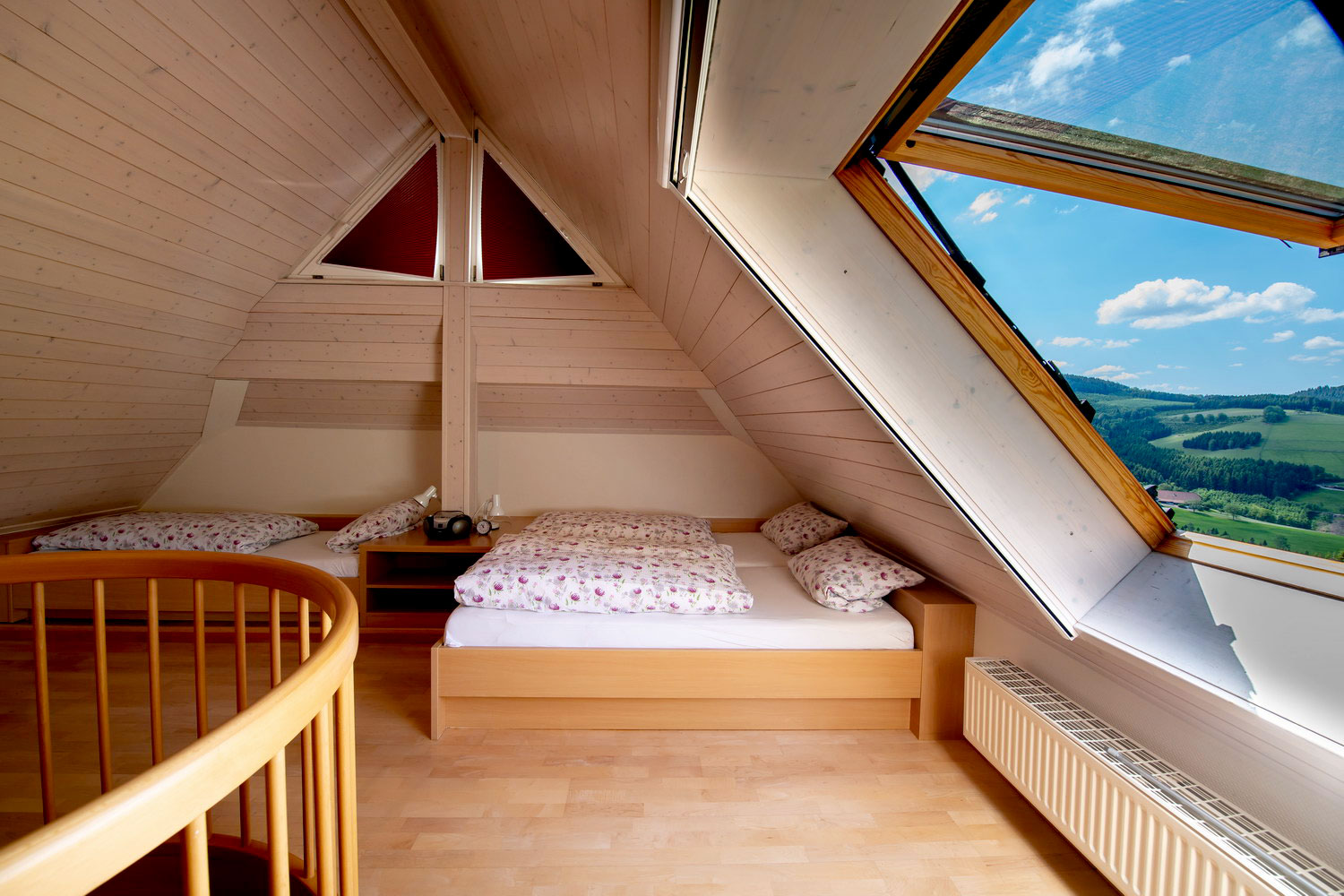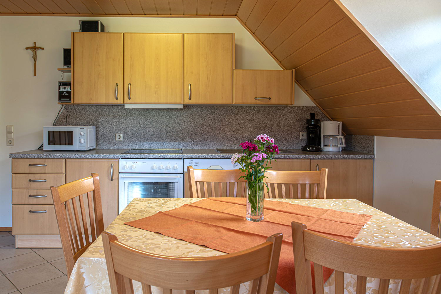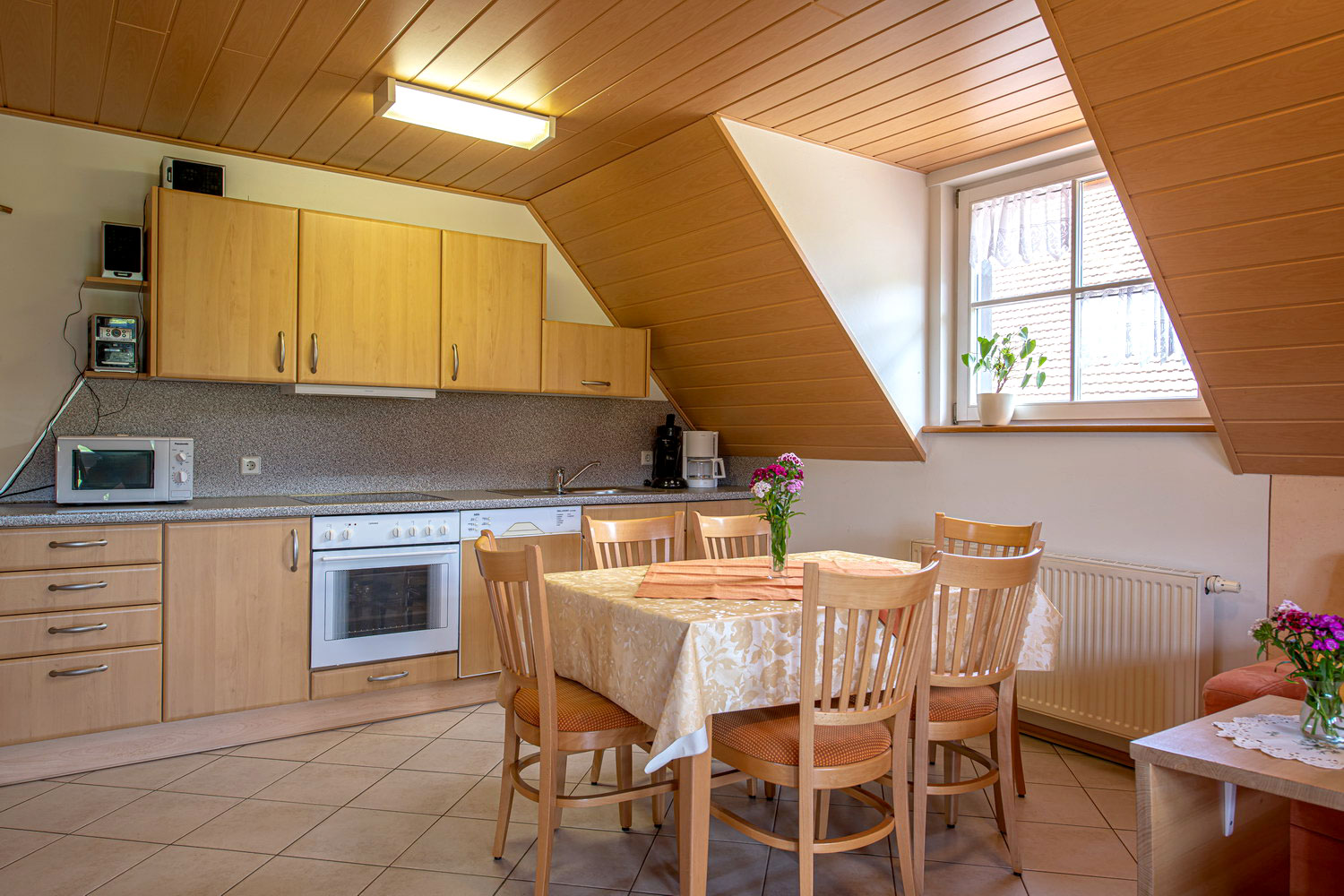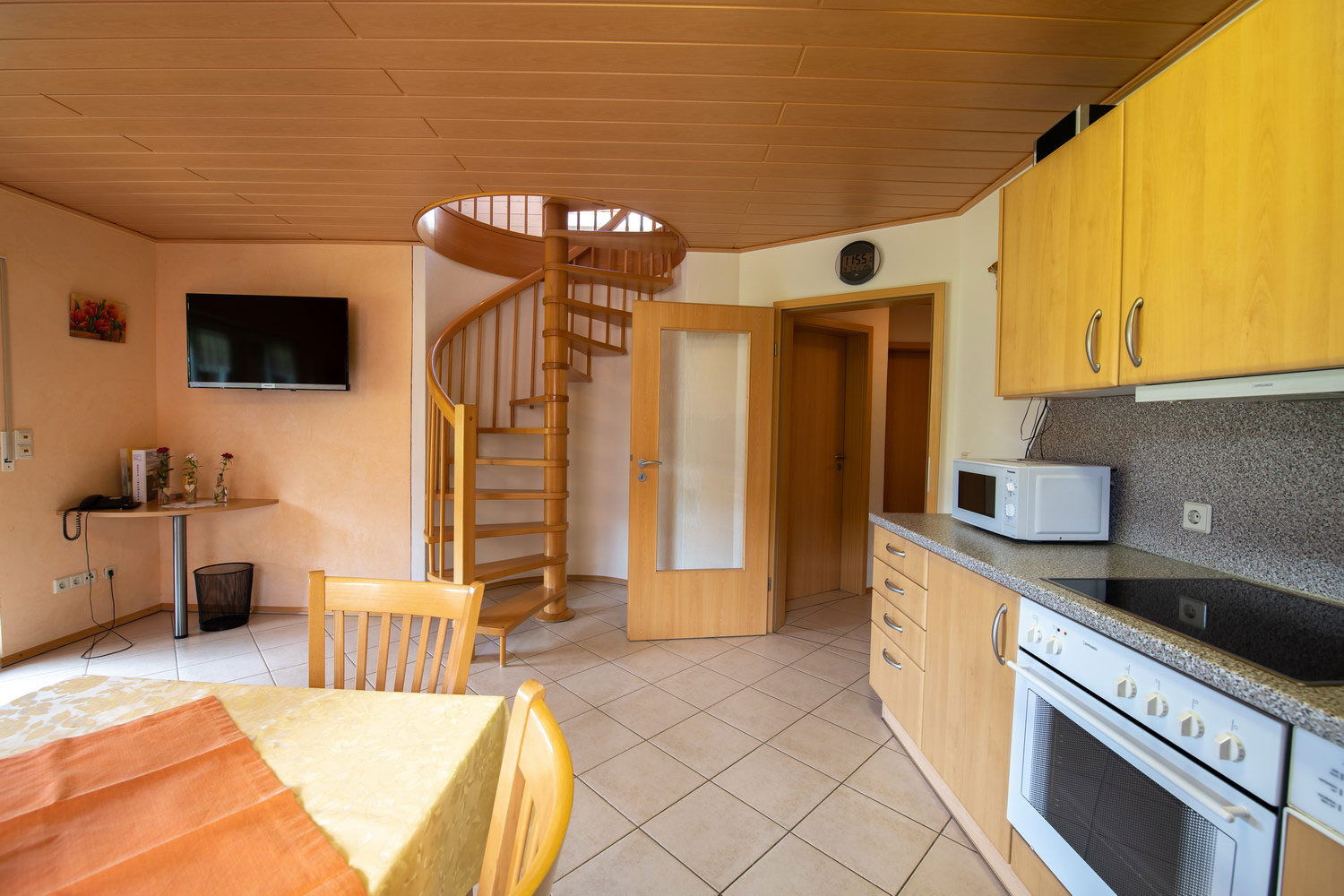Alle Möbel aus hellem Buchenholz, separate, große Balkone in jeder Wohnung, komplett eingerichtete Küchen mit Essecke (Küche Panoramablick mit umgehbarem Herd), SAT-TV, Telefon, Waschmaschine im Treppenhaus, Zustellbetten/Kinderbetten nach Bedarf.